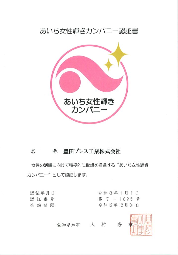 この度「あいち女性輝きカンパニー」として認証を受けました。
